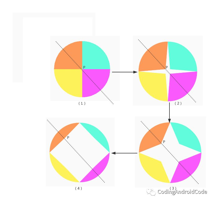 左上角这四分之一是由两条直线加四分之一圆弧组成,其中动画是由点P的位置变化形成的,P点坐标范围起于图1止于图4.