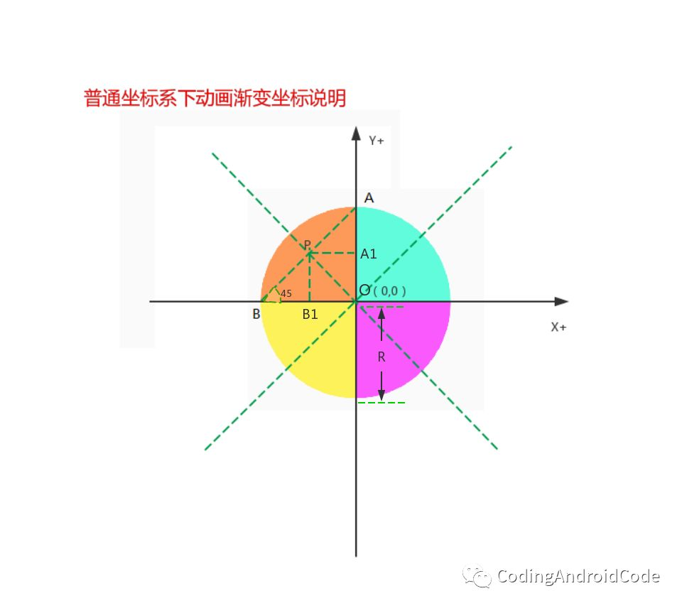 如上图所示我们假设要绘制的圆半径为R,那么可以得到P点所能取得的最大坐标值为(O-B1,O-A1),其中O-B1=O-A1。