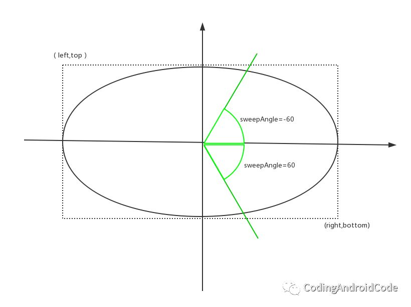 //第一个参数为圆弧所在矩形区域,第二个参数为截图的开始角度,第三个参数为截取的角度大小public void addArc(RectF oval, float startAngle, float sweepAngle)画图说明如下: