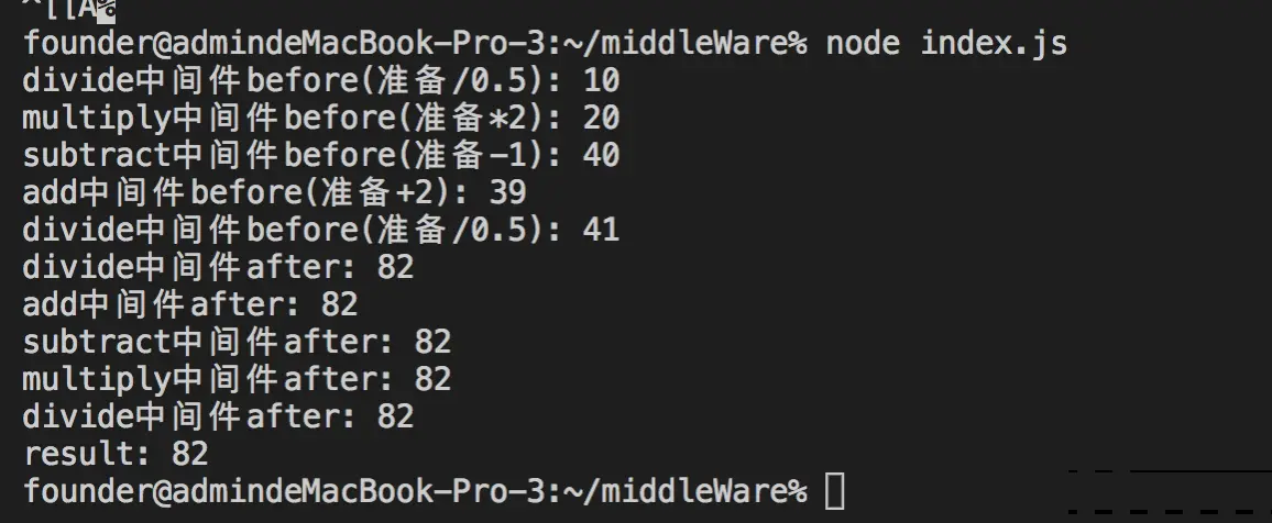 next为下一个启动中间件的方法,思路其实很简单,就是把multiply 的 里面一层即 function(str){ next() } 这一层作为substract 的next,再依次往上挂,所以我们可以写下如下代码