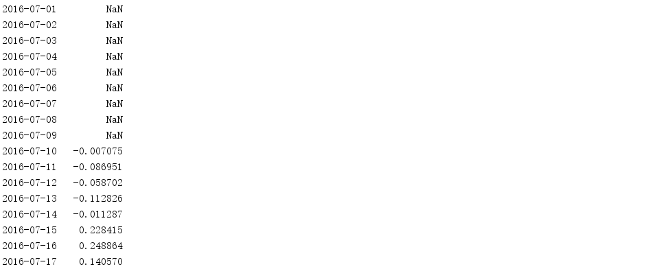 窗口中的值从覆盖整个窗口的位置开始产生,在此之前即为NaN,举例如下:窗口大小为10,前9个都不足够为一个一个窗口的长度,因此都无法取值。