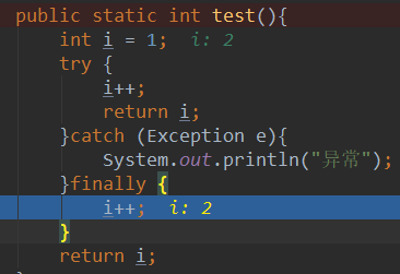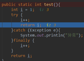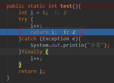 上面的代码,finally 一定会被执行,当执行完 finally 之后,i 的值变为了 3, 但是,返回的却还是 2,debug 跟踪如下: