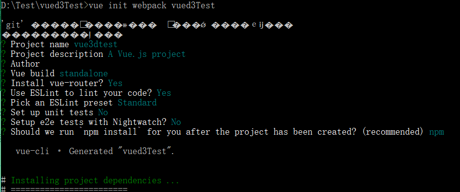 这条指令表示初始化一个vue项目,用webpack里面的项目模板,项目名称为vue3dTest。这里创建的项目是稍微复杂一些的用于正式项目开发的模板。