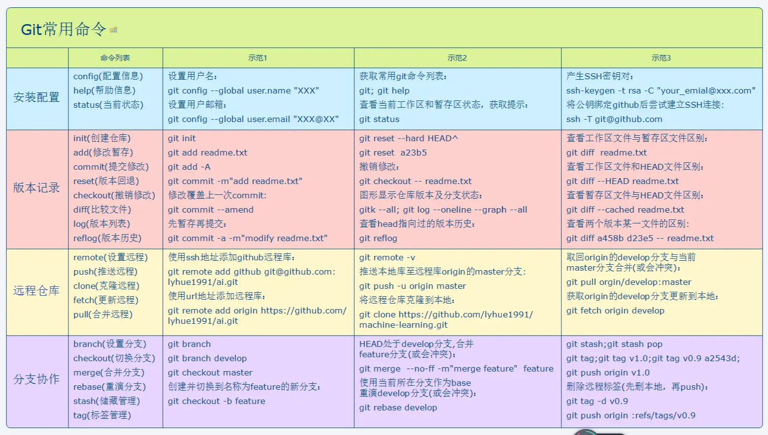 | git reset –hard HEAD^ | 文件跳到某版本,hard后是版本名,可以用HEAD系列表示,可以直接输commit id,见git log.输id只需输前几位 |