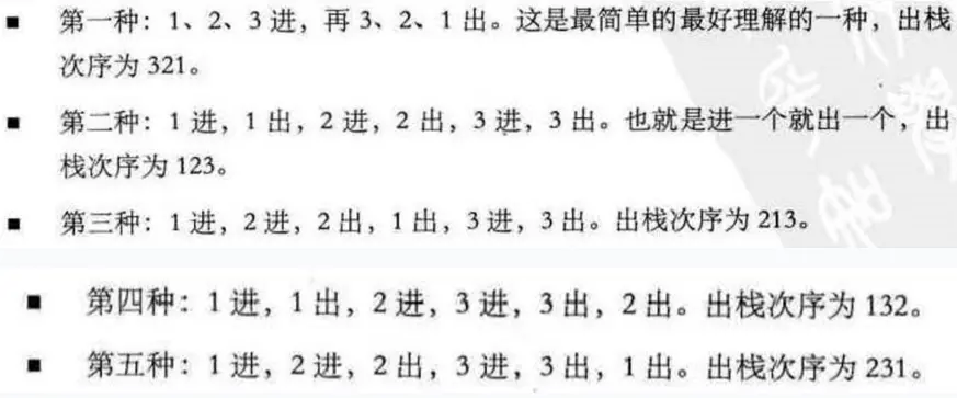 从这个简单的例子就能看出,只是 3 个元素,就有 5 种可能的出栈次序,如果元素数量多,其实出栈的变化将会更多的。这个知识点一定要弄明白。