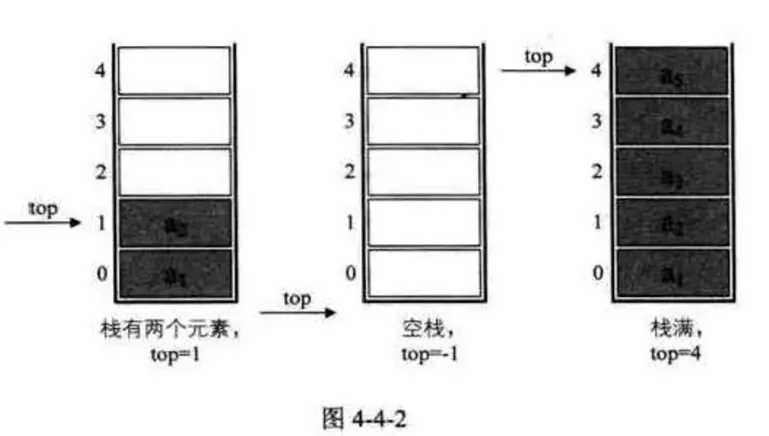 若现在有一个栈,StackSize是5,则栈普通情况、空栈和栈满的情况示意图如图4-4-2所示。