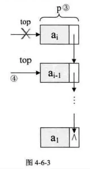 假设变量 p 用来存储要删除的钱顶结点,将栈顶指针下移一位,最后释放 p 即可,如图 4-6-3 所示。