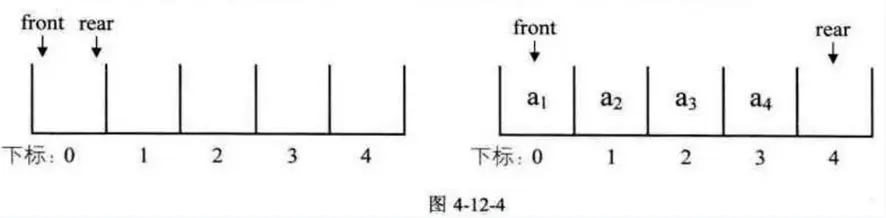 为了避免当只有一个元素时,队头和队尾重合使处理变得麻烦,所以引入两个指针, front指针指向队头元素,rear指针指向队尾元素的下一个位置,这样当front等于rear时,此队列不是还剩一个元素,而是空队列。 假设是长度为 5 的数组,初始状态,空队列如图 4-12-4 的左图所示, front 与 rear 指针均指向下标为 0 的位置。 然后入队 a1、 a2、 a3、 a4, front 指针依然指向下标 为 0 位置,而 rear 指针指向下标为 4 的位置,如图 4-12-4 的右图所示。