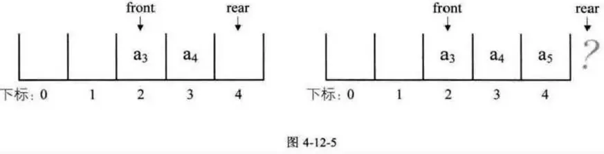 出队 a1、 a2,则 front指针指向下标为 2 的位置, rear 不变,如图 4-12-5 的左图所示,再入队 a5,此时 front 指针不变, rear 指针移动到数组之外。嗯?数组之外, 那将是哪里?如图 4-12-5 的右图所示。