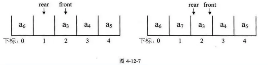 接着入a6,将它放置于下标为 0 处, rear 指针指向下标为 1 处,如图 4-12-7 的左图所示。若再入队a7,则 rear 指针就与front 指针重合,同时指向下标为 2 的位 置,如图 4-12-7 的右图所示。