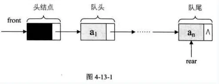队列的链式存储结构,其实就是线性表的单链表,只不过它只能尾进头出而已, 我们把它简称为链队列。为了操作上的方便,我们将队头指针指向链队列的头结点,而对尾指针指向终端结点,如图4-13-1所示