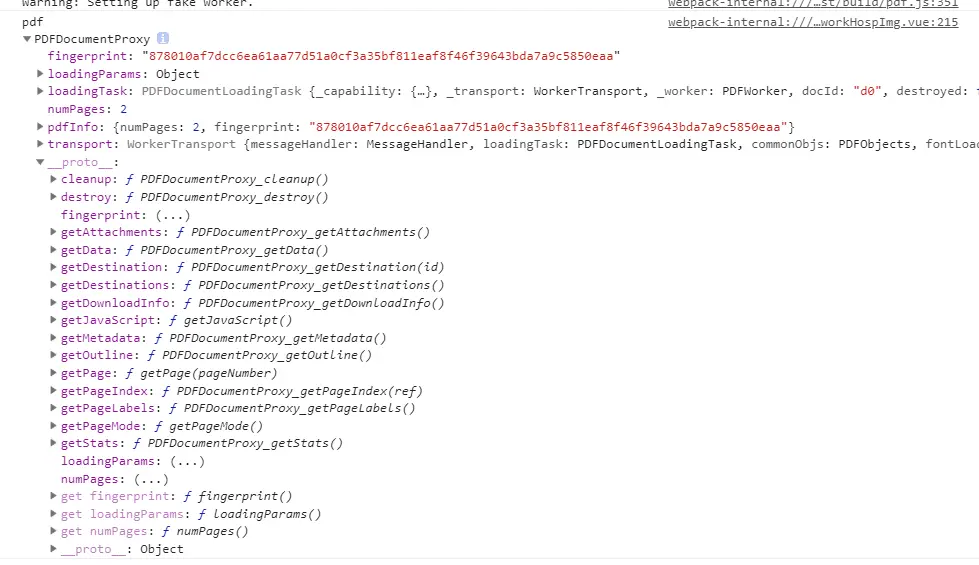 随后调用pdf.js插件的getDocument方法,getDocument是一个promise,所以使用异步函数的话前面需要加await关键字(不使用异步函数的话在方法后面加.then((pdf)=>{.......}),这个pdf对象和我这个pdf对象是同一个,同时这里暂时也没考虑异步操作出错的情况,有要求的话可以在加个catch捕获错误) getDocument方法的参数是一个对象,对象键名为data,值为base64解码后的值,此方法返回一个pdf对象,这个对象有几个属性,可以打印出来观察一下