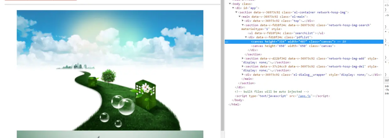 渲染出页面后还有个要注意的点,Vue框架会给每个组件的DOM节点生成一个自定义属性,而节点动态生成的canvas节点,并没有data-v-xxxxx这样的自定义属性