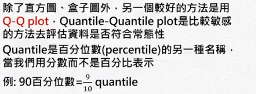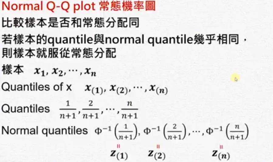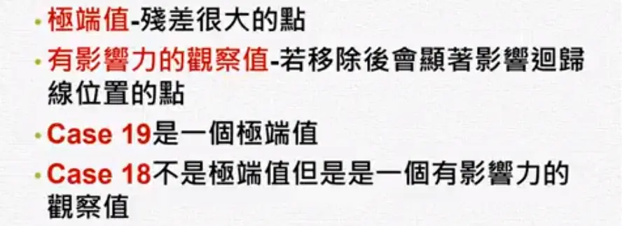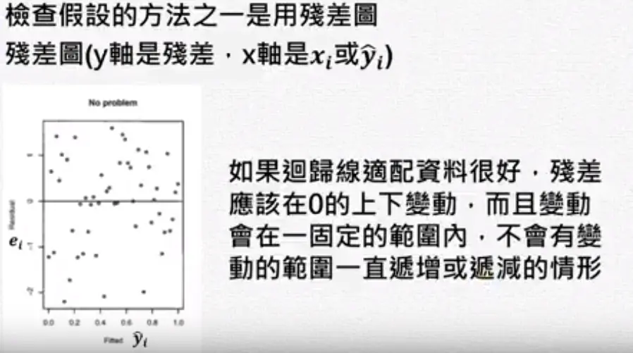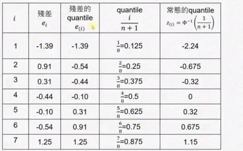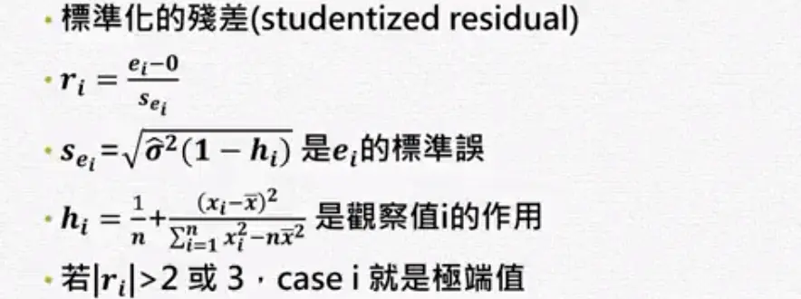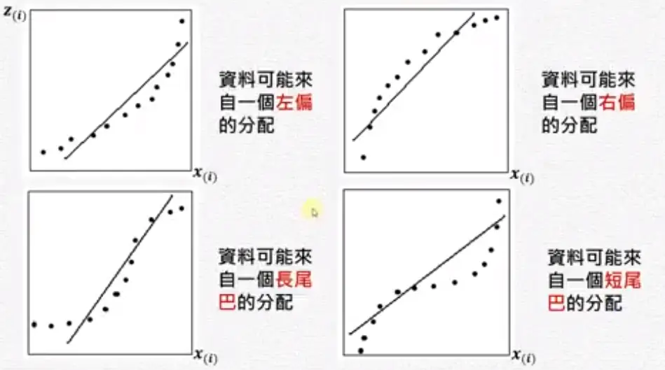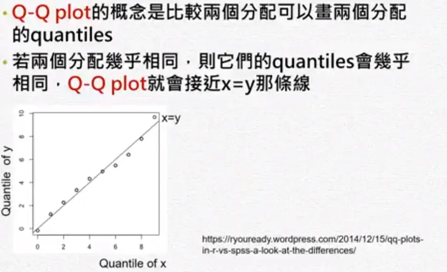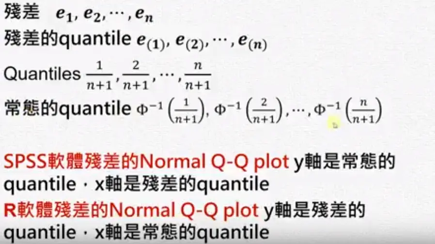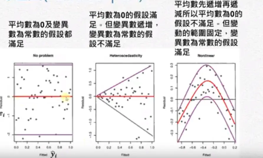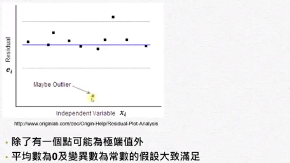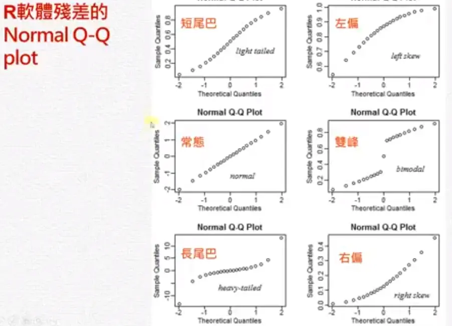 残差分析 wakacaca 2018-10-19 1,795 阅读1分钟 www.youtube.com/watch?v=dh6… 残差分析 简单线性回归的模式与假设 需要检查下面假设 残差图(Residual plot) 第二个图刚开始很小,后来上下变动越来越大,所以它的残差变异数在递增,违反了均值性(异质性)。 第三个图刚开始残差是负的,然后变成正的,再后来变成负的。 检查常态性 常态性是一个对称的,左偏或右偏都不满足常态性。 盒子图中如果平均数小于中位数是左偏。 Normal Q-Q plot常态几率图 第一图曲线开口向上,第二图曲线开口向下。长尾巴分配就是T字型。 残差的Normal Q-Q plot常态几率图 ##范例: 残差的quantile就是将残差从小到大排好。 常态的quantile是根据几率(quantile)去查它的值。 极端值与有影响力的观察值 极端值的确认