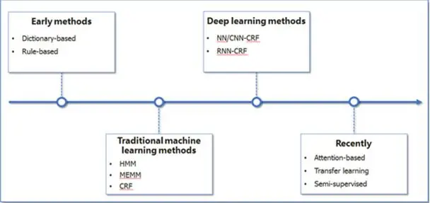 NER一直是NLP领域中的研究热点,现在越来越多的被应用于专业的领域,如医疗、生物等。这类行业往往具有大量的专业名词,名词与名词之间相互之间存在着不同种类的关系。NER的研究从一开始的基于词典和规则的方法,基于统计机器学习的方法,到近年来基于深度学习的方法,NER研究的进展趋势如下图所示。