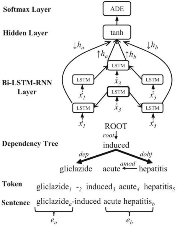 在论文《A neural joint model for entity and relation extraction from biomedical text》中,作者将联合学习的方法用于生物医学实体识别和关系抽取当中,在关系分类时,输入的语句首先进行依存分析构建起依存句法树,然后将这种树状结构输入到Bilstm+RNN的网络中进行关系分类,如下图: