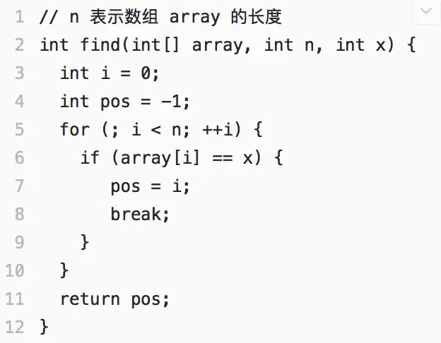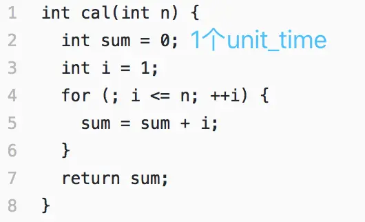 粗略假设每行代码的执行时间是一定的为unit_time(实际上每行代码对应的CPU执行个数、时间都不一样)。一段代码的时间复杂度就可以看成是这段代码需要执行的总行数。