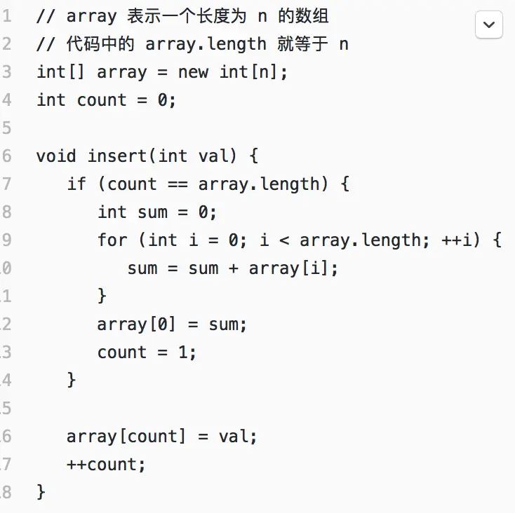 - 乘法法则:嵌套代码(一段代码中嵌入了另一段代码)的复杂度等于嵌套内外代码复杂度的乘积。