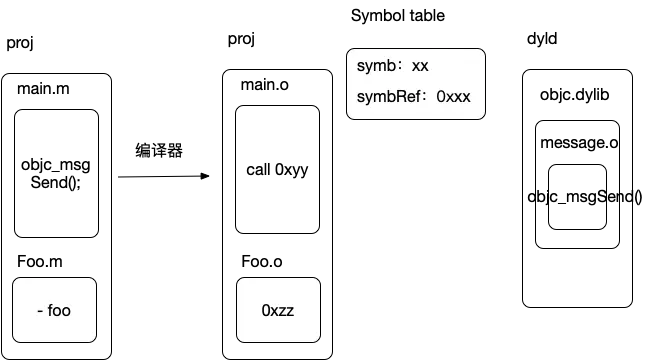 上图中,dyld 会将 0xyy 重定向为 objc_msgSend() 指令块的地址(运行时完成,动态链接)。- foo 的首地址被存储在名为 Foo 的类对象中(类似于 C++ 的虚函数表)。然后该指令块会在运行时被调用。了解更多