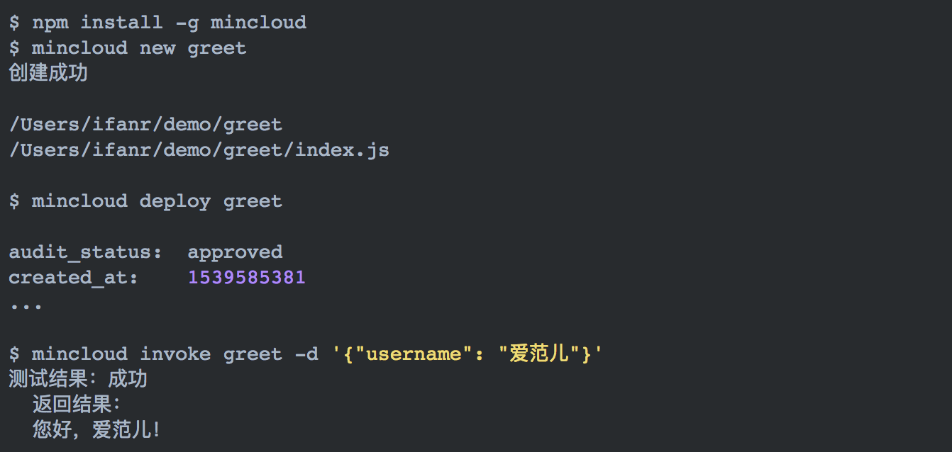 在云函数控制面板上可以很方便地创建、编辑、配置、测试函数。但我们也知道,工程师(我们)永远更想在自己喜欢的编辑器里写代码、调试代码。 因此,我们动手做了这一款命令行工具——mincloud。使用方式很简单: