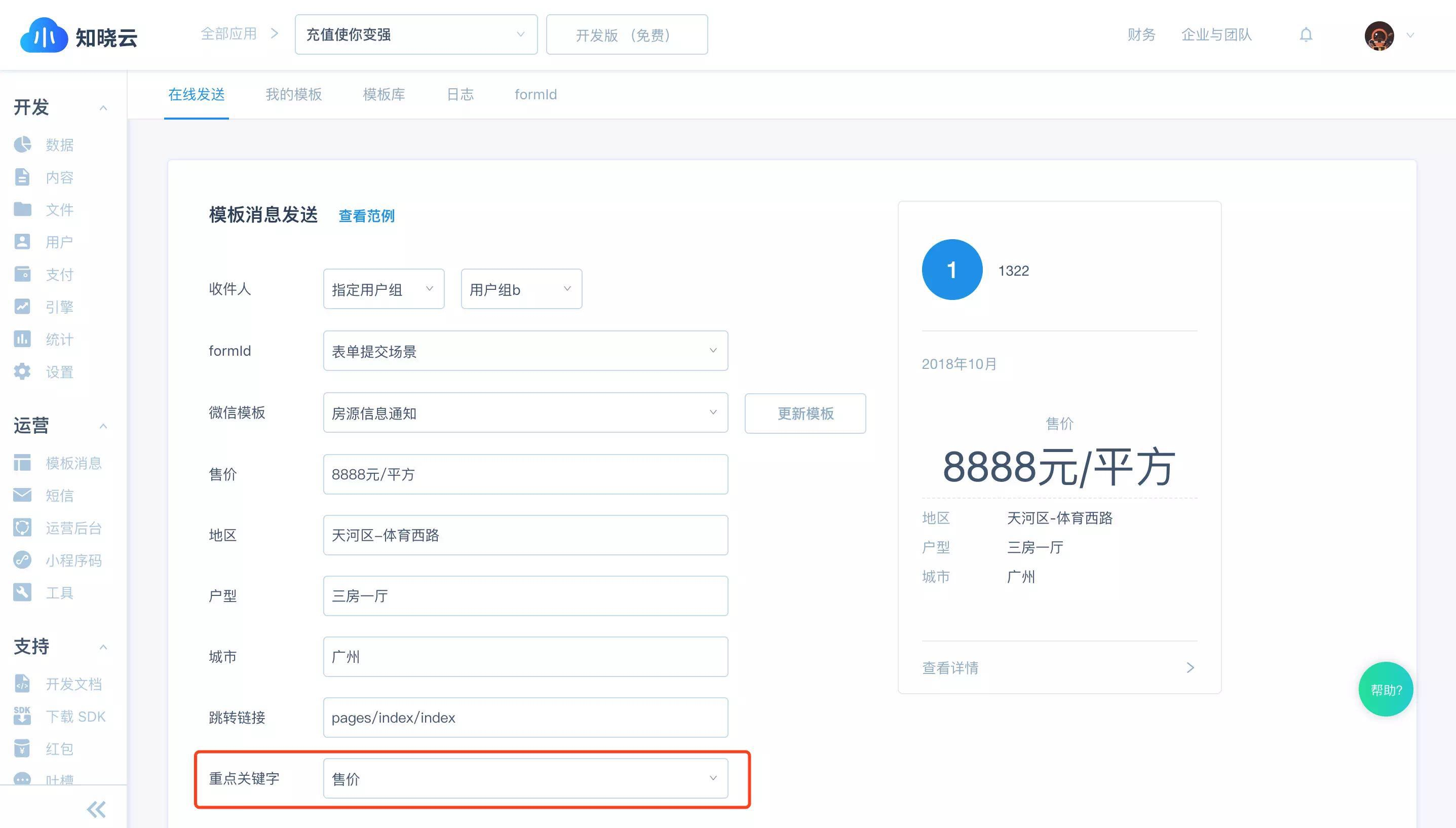 模板消息支持配置重点关键字,恩,微信推出的新功能,我们当然第一时间跟进。