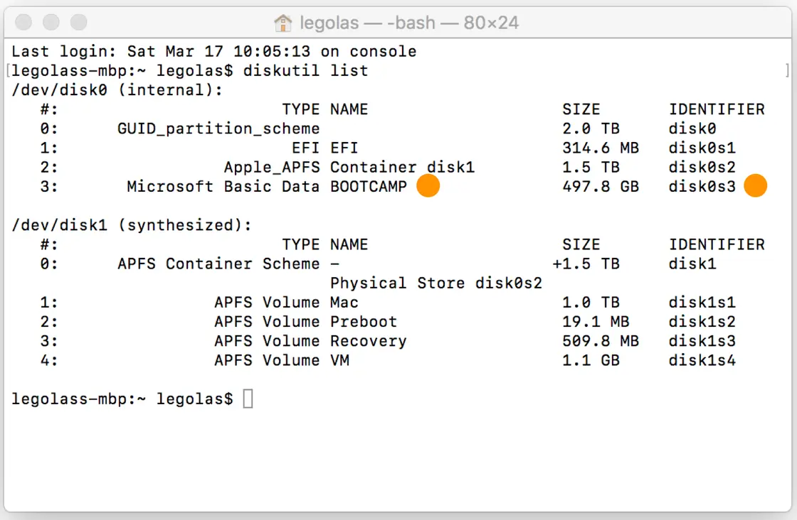 若你的电脑是 iMac 的 Fusion Drive 版本,那么你的电脑中则会有两块物理磁盘,BOOTCAMP 一般会默认使用第二块硬盘,此时你的 BOOTCAMP 盘符就会变成 disk1s4 这类格式,这里的数字 1 代表着电脑中的第二个物理磁盘,数字 4,代表着 BOOTCAMP 处在这块磁盘中的第四个分区。