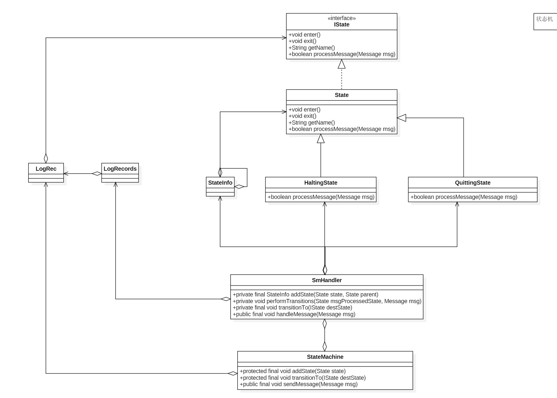 - State.java 默认实现的IState接口的状态, 需要实现新的状态时,一般只需要集成State重写里面方法即可