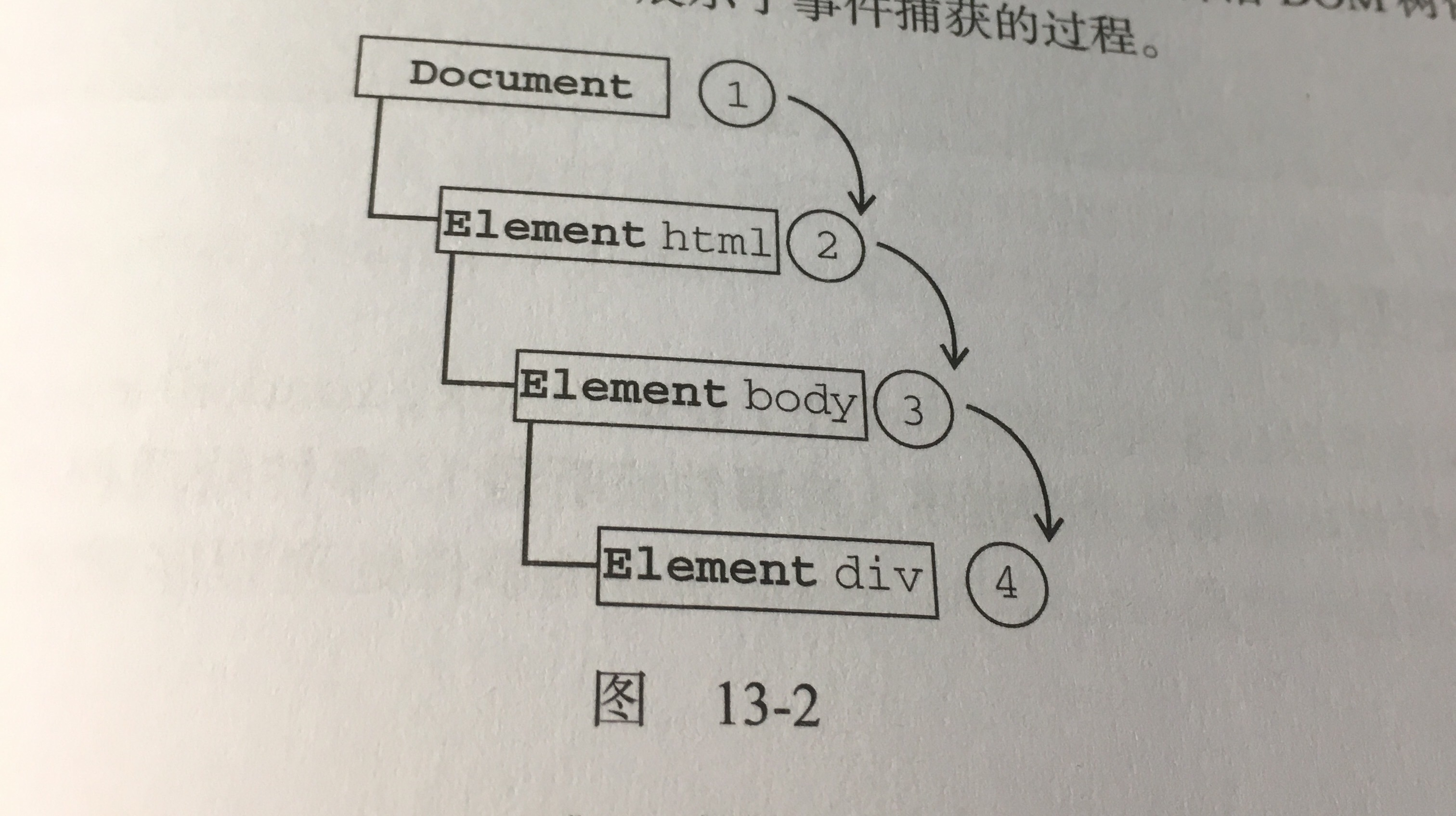 在事件捕获过程中,document对象首先接收到click事件,然后DOM树依次向下,一直传播 到事件的实际目标,即<div>元素,图13-2展示了事件捕获的过程(这图是我从《JavaScript 高级程序设计 第三版》)拍下来的,将就看一下吧。