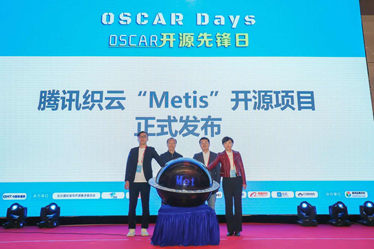 OSCAR 开源先锋日由中国信息通信研究院主办,中国信通院云大所所长何宝宏,中国信通院云大所云计算部副主任栗蔚,腾讯云副总裁赵建春,腾讯云运营部总经理肖世广共同参与Metis开源发布仪式。