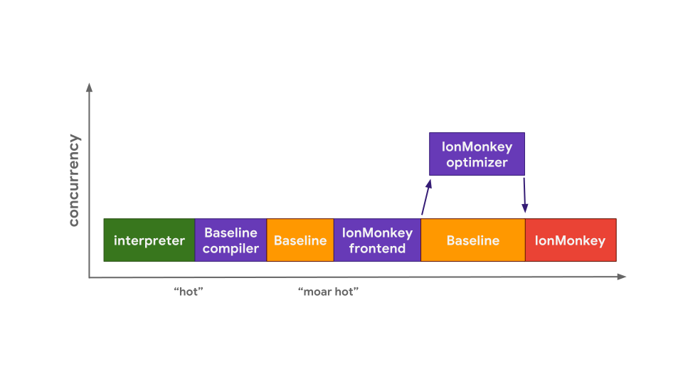 如果 Baseline 代码运行了一段时间,SpiderMonkey 最终会激活 IonMonkey 前端,并启动优化器 - 这与 V8 非常相似。当 IonMonkey 进行优化时,代码在 Baseline 中会一直运行。当优化器处理完成后,被执行的是优化后的代码而不是 Baseline 代码。