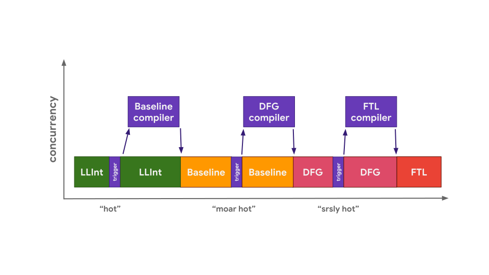 我们往往需要在启动延迟与执行速度之间做出一些取舍,而这便是一些 JavaScript 引擎决定是否在流程中加入优化层的原因所在。例如,SpiderMonkey 在解释器和完整的 IonMonkey 优化编译器之间添加了一个 Baseline 层: