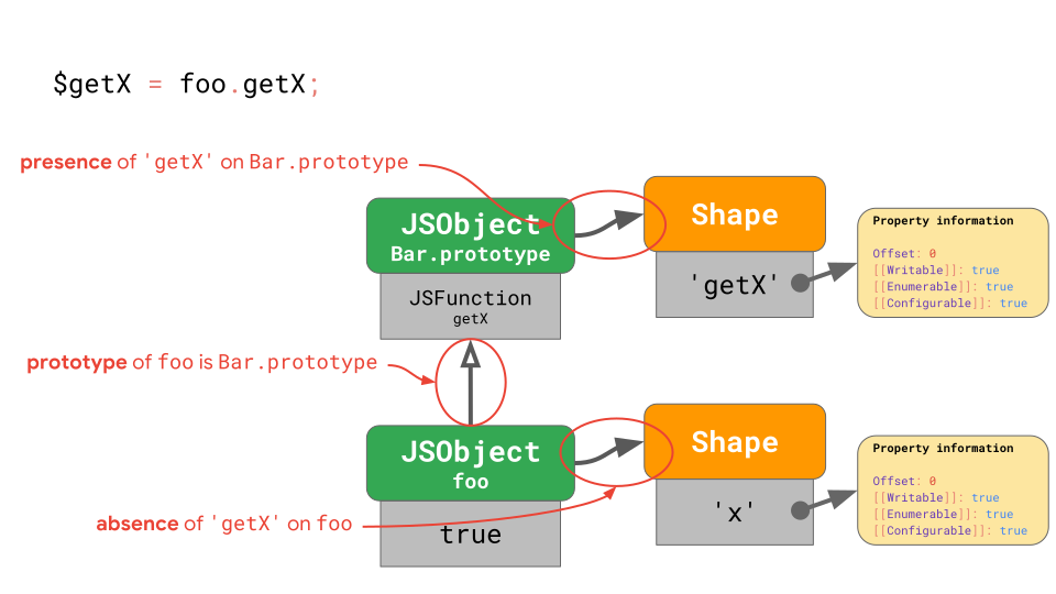在这个例子中,我们调用了foo,getX()函数两次,但是每次都有不同的含义和结果。这就是为什么尽管原型只是 JavaScript 中的对象,但优化原型属性访问对于 JavaScript 引擎而言比优化常规对象的属性访问更具挑战性的原因了。
