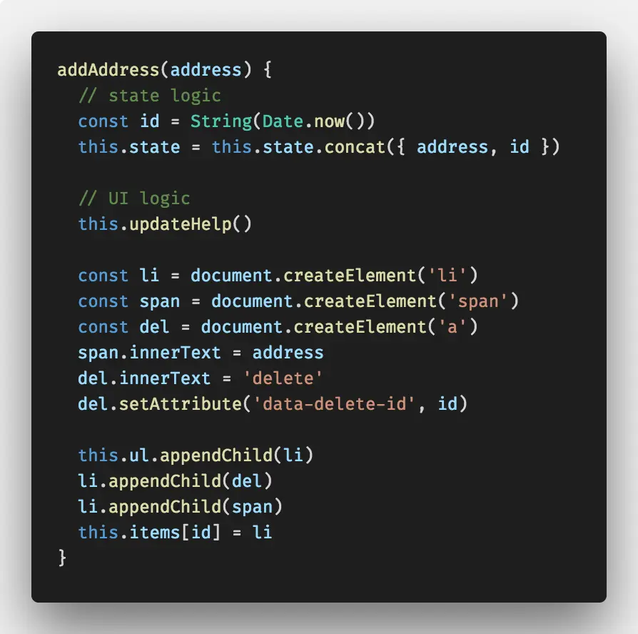 但这也不是(不使用框架的)最大问题。最大的问题是每当状态发生改变时都要(手动)更新 UI。每次状态更新时,都需要很多代码来改变 UI。当添加电子邮件地址时,只需要两行代码来更新状态,但要十三行代码更新 UI。(此例中)我们已经让 UI (界面与逻辑)尽可能简单了!!
