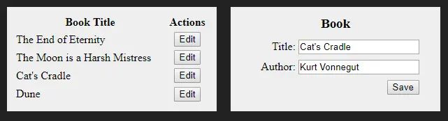 为了向您展示我的意思,我将使用一个简单的书籍CRUD(译者注:增加(Create)、读取查询(Retrieve)、更新(Update)和删除(Delete))屏幕(如此简单,它没有创建和删除操作)。