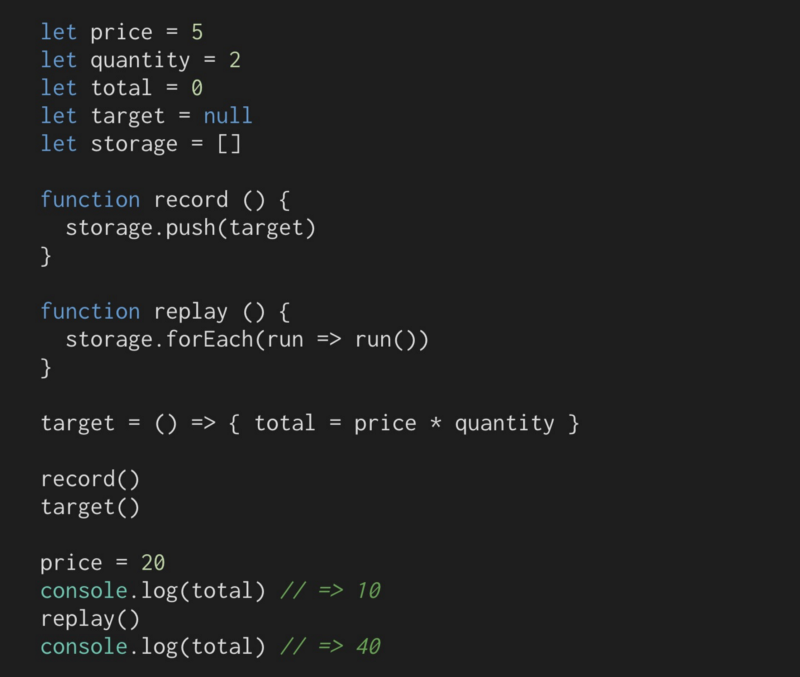首先,我们需要一些方法告诉我们的应用程序,“我即将运行的代码,存储它,我可能需要你在另一个时间运行它。”然后我们将要运行代码,如果价格或数量变量得到更新,再次运行存储的代码。