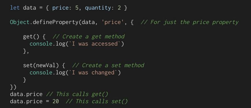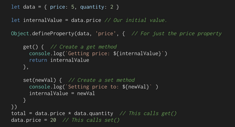 我们需要一些方法来挂钩数据属性(如价格或数量),所以当它被访问时我们可以将目标保存到我们的订阅者数组中,当它被更改时,运行存储在我们的订阅者数组中的函数。