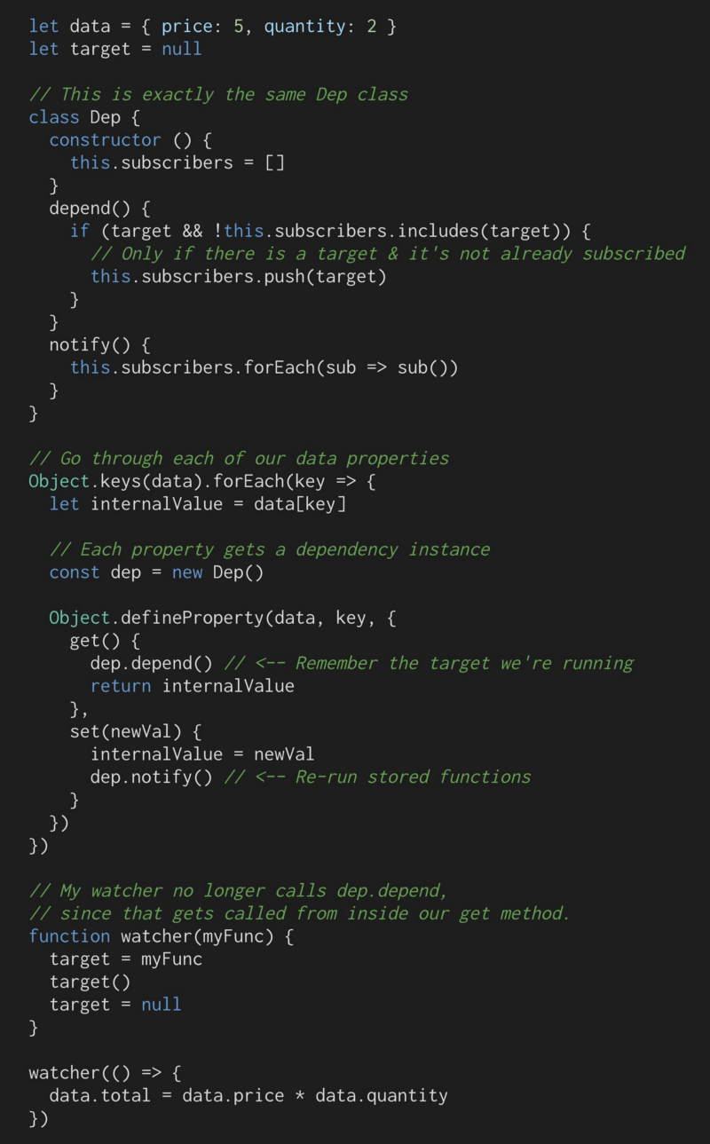 由于访问了data.price值,我希望price属性的Dep类将我们的匿名函数(存储在目标中)推送到其订阅者数组(通过调用dep.depend())。由于访问了data.quantity,我还希望quantity属性Dep类将此匿名函数(存储在目标中)推送到其订阅者数组中。