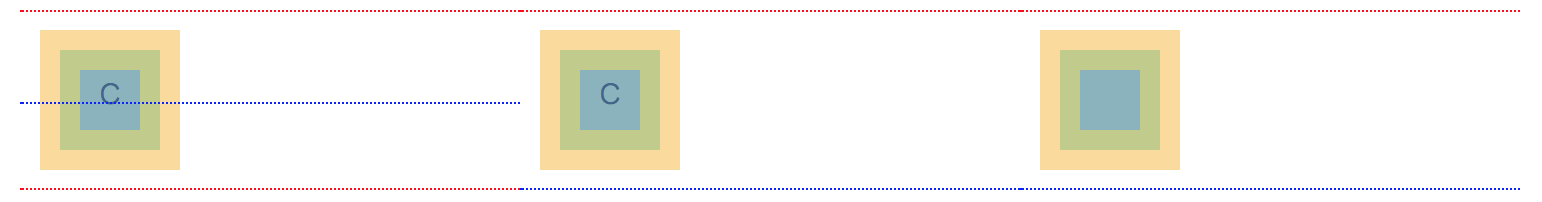 从左到右:包含流内内容(“c”)的行内块、包含流内内容且设置了溢出(overflow: hidden)的行内块和未包含流内内容(但内容区有高度)的行内块。红线表示外边距的边界,黄色是边框,绿色的内边距,蓝色是内容区,蓝线是每个行内块元素的基线。