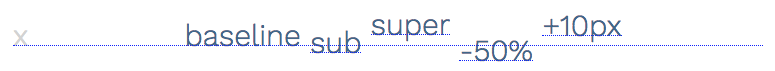 baseline:元素基线与行盒子基线重合。sub:元素基线移动至行盒子基线下方。super:元素基线移动至行盒子基线上方。- <百分比值>:元素基线相对于行盒子基线向上或向下移动,移动距离等于