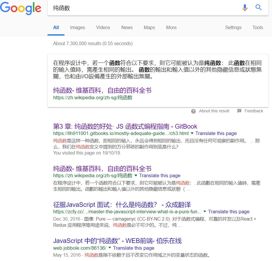 于是,猫猫去google了“纯函数”。没想到,排在前面的结果竟然全跟Javascript相关。