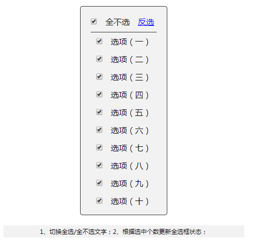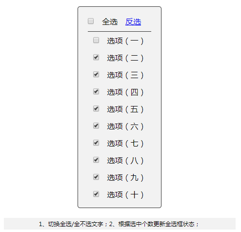 (2)更新全选框的状态,判断全选框状态的更新函数可以通过计数input[i]处于选中状态的个数(n)来设计,如果n == length,全选框为选中状态,后面的文字变成“全不选”;否则,全选框为未选中状态,后面的文字为“全选”。