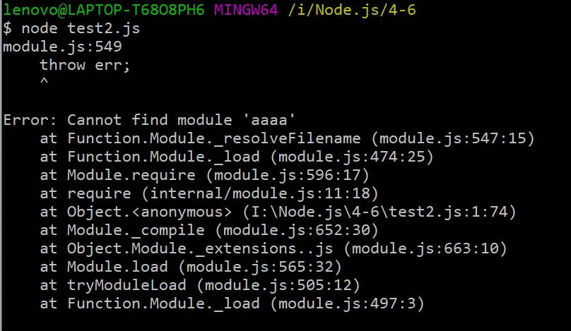 在使用require()方法加载模块的时候,如果写错了模块的名称就会引起程序报错,require()函数将会抛出异常,程序示例: