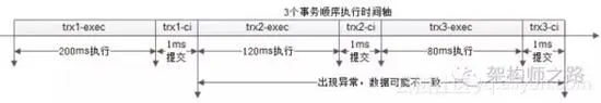 ● 串行事务方案 ,总执行时间是303ms,最后202ms内出现异常都可能导致不一致;