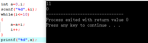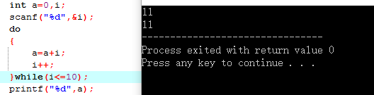 如图所示,当输入i大于10时二者的结果就不同了。这是因为while循环是先判断后执行,而do-while循环是先执行后判断。对于大于10的数,while语句中编译器不循环循环体,而do-while语句编译器则要执行一次循环体。