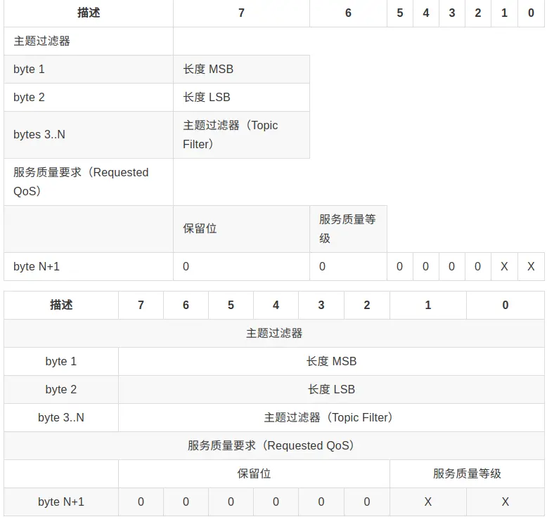 请求的最大服务质量等级字段编码为一个字节,它后面跟着UTF-8编码的主题名,那些主题过滤器 /和QoS等级组合是连续地打包。
