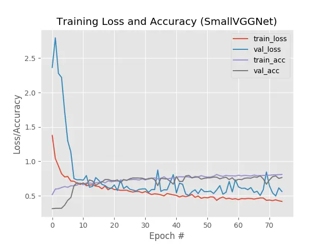 图12:我们对Keras精度/损失图的深度学习表明,使用SmallVGNet模型,我们在动物数据上获得了78%的准确性