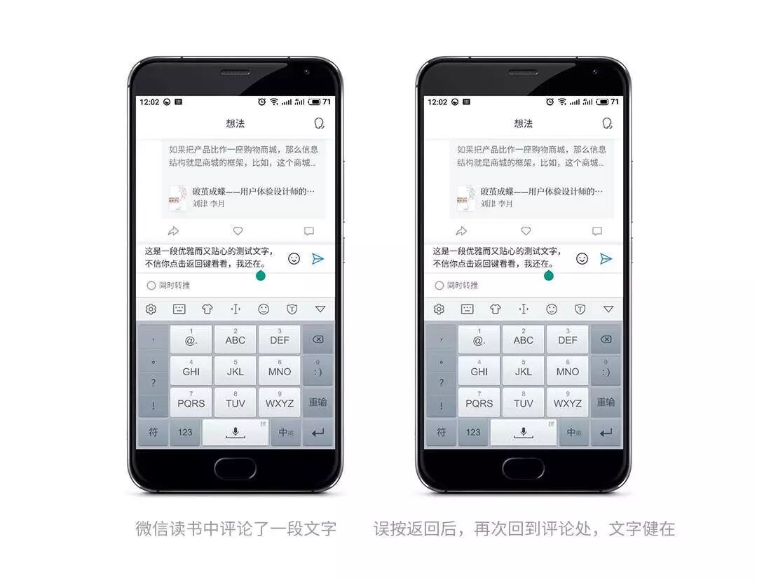 再看微信读书,无论怎么返回怎么误操作,这段评论文字都忠实地坚守岗位,不会消失。
