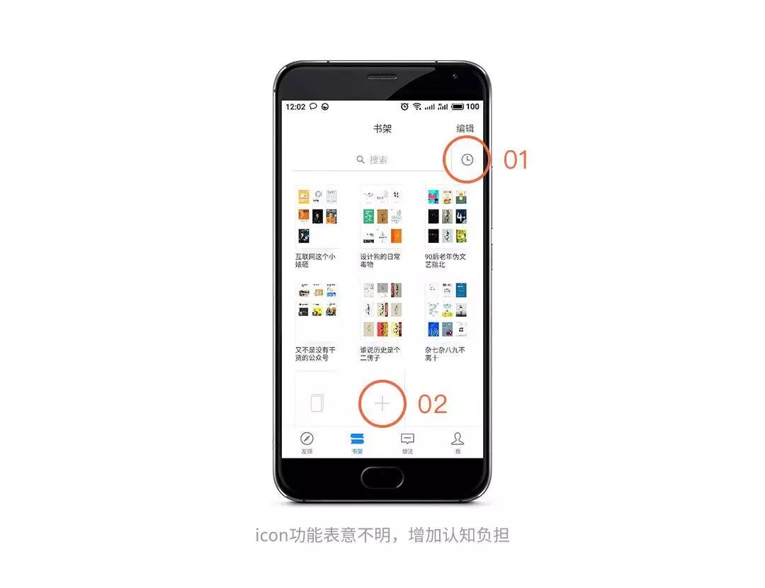 标注02处,一个加号在用户潜意识中会认为是添加的意思,而又紧跟一个个的图书分组后,会被解读为添加“图书分组”,而实际上点击此icon会跳转到“书城”界面。