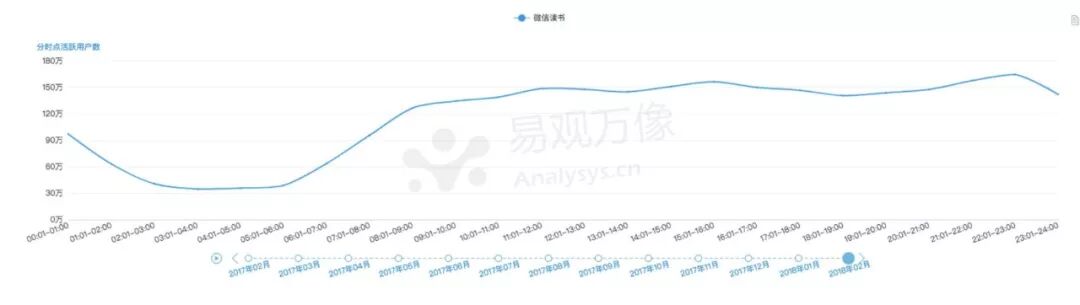 根据数据显示,晚上9点到12点是用户使用的高峰期。说明有不少用户把以前睡前刷微博、刷朋友圈、玩游戏的时间分配一些给了微信读书。