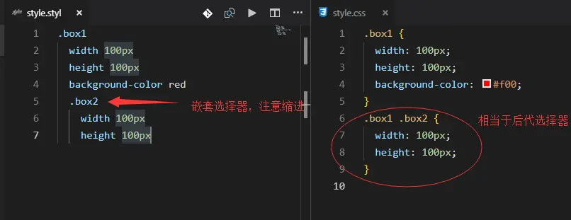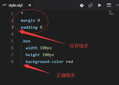 值得注意的是,在我们编写stylus文件的时候,一定要注意缩进,因为stylus就是根据缩进来识别选择器层级和对应css样式规则的